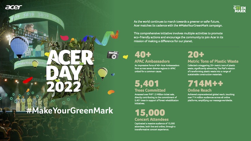 Acer Philippines staged a “Green Mark” concert featuring a line-up of famous Filipino artists, and fans earned tickets through green initiatives like donations to The Green Earth Heritage Foundation and plastic contributions to The Plastic Flamingo. This made the event a milestone in environmental commitment.