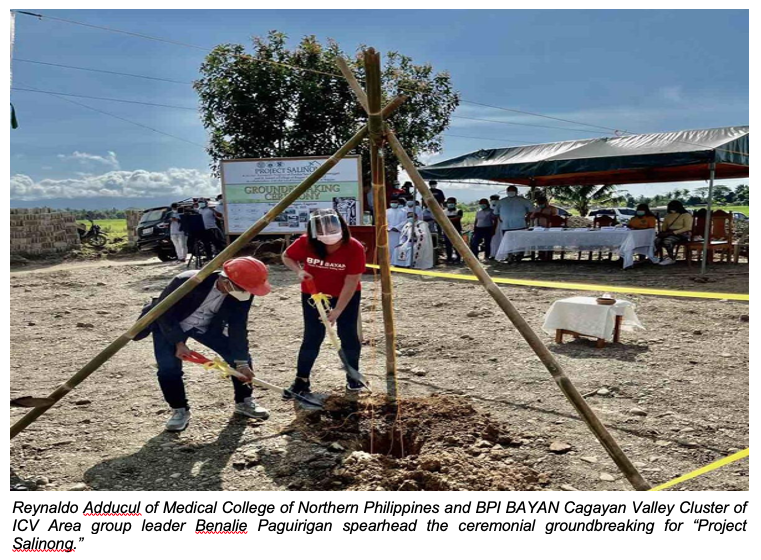 Reynaldo Adducul of Medical College of Northern Philippines and BPI BAYAN Cagayan Valley Cluster of ICV Area group leader Benalie Paguirigan spearhead the ceremonial groundbreaking for “Project Salinong.”