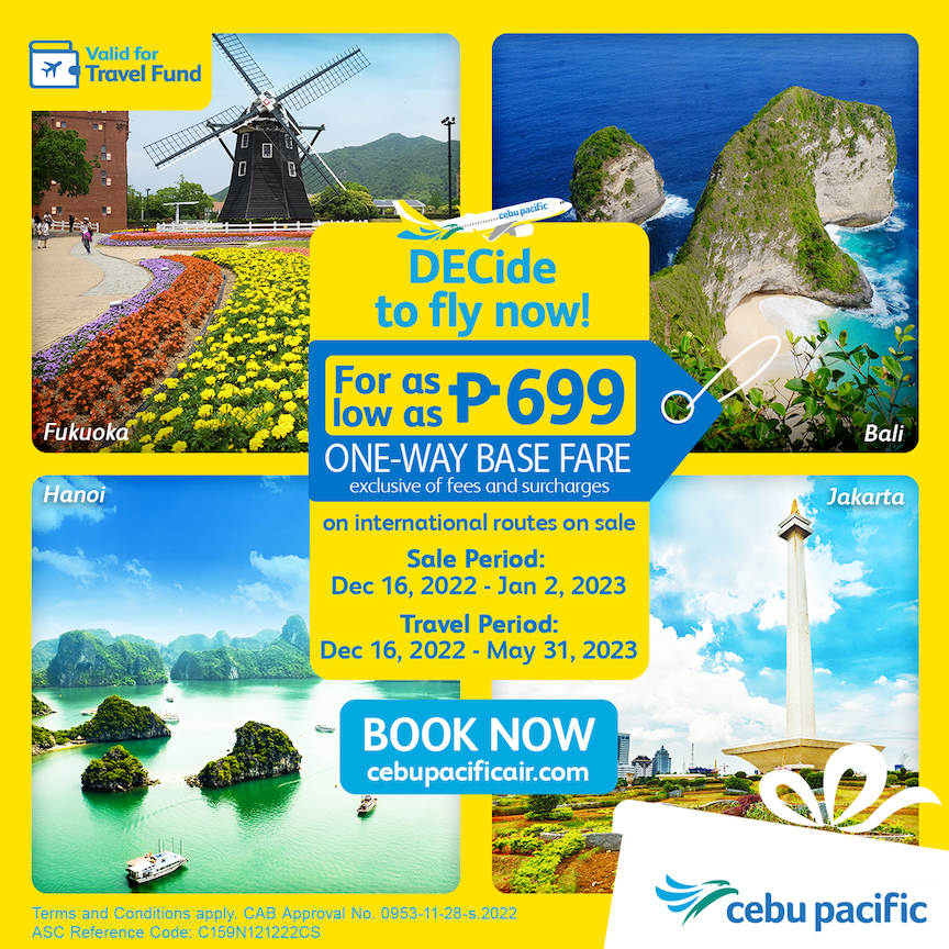 Beginning December 16, 2022, until January 2, 2023, passengers may avail themselves of tickets for as low as PHP 699 one-way base fare (exclusive of fees and surcharges).
