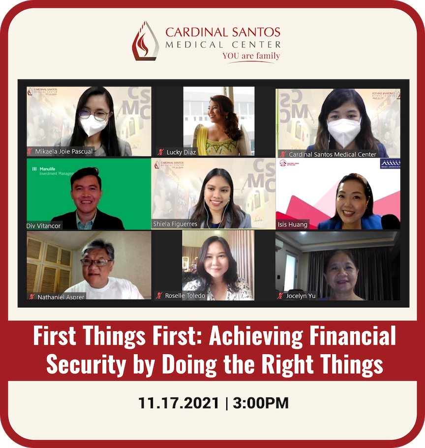 After successfully producing webicons related to its flagship services throughout the year, Cardinal Santos Medical Center (CSMC) continues to educate the general public about the importance of health and wellness, including financial stability. With this, CSMC taps into the financial aspect of overall human wellness with “First Things First: Achieving Financial Security by Doing the Right Things”, their newest webicon held on November 17 via ZOOM.