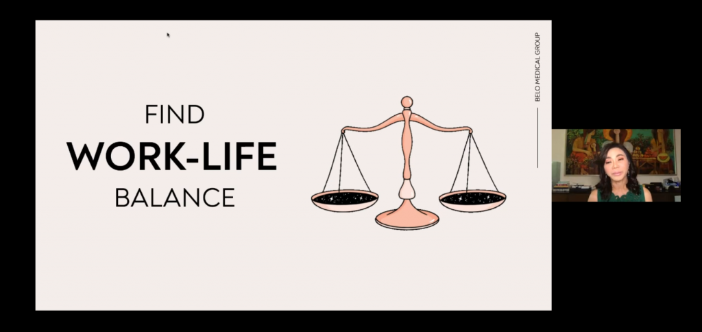 • Balance: as more companies embrace remote working to keep their people safe, many struggle with the blurring lines between the office and home. Dr. Belo shared ideas on how one can find work-life balance by setting a specific work area and work schedule, dressing up even at home, and protecting one’s mental health by doing projects that will make you happy and journaling your progress. She also mentioned taking care of your skin even while indoors. Screen time can be just as harsh as sunlight and can cause hyper pigmentation and premature aging.