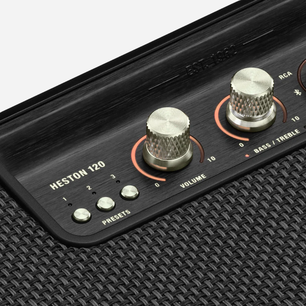 Marshall app: Effortlessly set-up and customise the sound of your Heston 120 with our dedicated app. As well as adjusting channels and volume, you can use the app to tailor EQ settings for more bass or treble. Make the most of your space by adjusting the room calibration to get the perfect musical fit.
