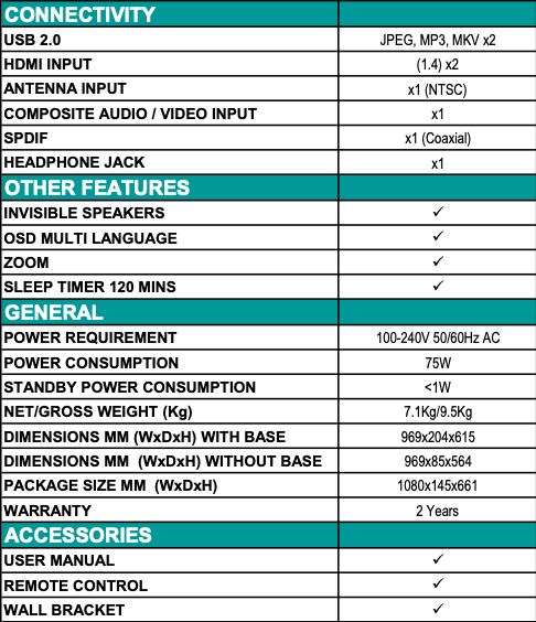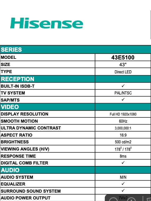 The Hisense 43E5100 has a 1920 x 1080 Full HD resolution and allows you can watch HD movies direct from your USB or hard drive. Just Plug in your hard drive, flash drive, or other USB storage device to your TV and view them on the large HD screen. It also features invisible speakers that provide better design & deeper sound creation. Down firing technology offers surround sound to the entire room.