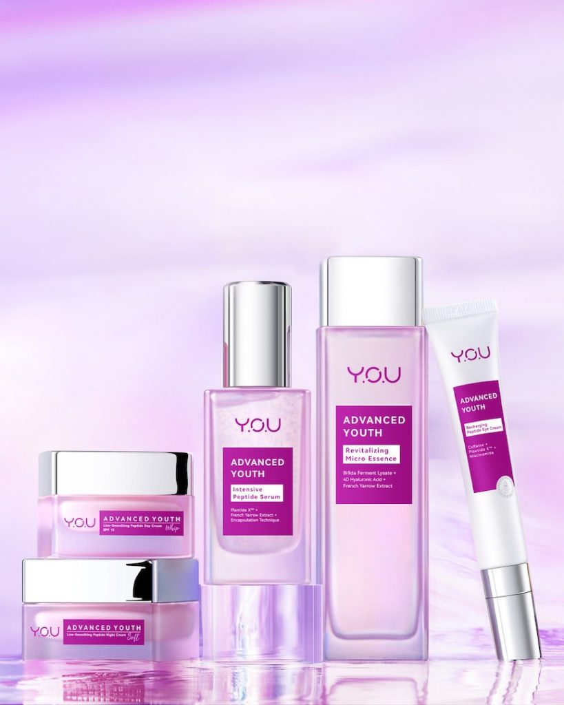 This skincare series currently includes a Revitalizing Micro Essence that strengthen the skin’s barrier, an Intensive Peptide Serum that helps in reducing the appearance of fine lines, and our current best-seller: the Recharging Peptide Eye Cream, widely known for enhancing the under-eye area by reducing puffiness and dark circles. In addition to these, Y.O.U Beauty recently introduced two new products under the Advanced Youth Series: the Line-Smoothing Peptide Day Cream with SPF 15 that helps maintain skin elasticity for that lifted and bouncy skin, and Line-Smoothing Peptide Night Cream that combats the early signs of aging during the skin’s nightly repair phase while intensely hydrating skin. Add these to your holy grail regime to future proof your skin!
