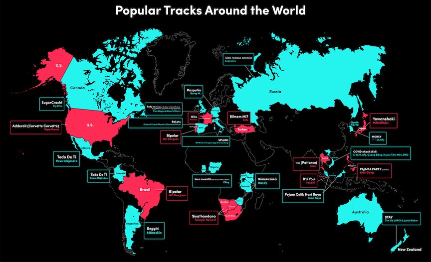 We welcomed some thousands of established music artists to TikTok as well these last 12 months: from Led Zeppelin to Rod Stewart, the late great Amy Winehouse to the wonderful Abba and their first new music in 40 years. Hit after hit, story after story, the world has discovered, rediscovered and loved the music on TikTok in 2021. Here’s what was top of the pops around the world for our community’s video creations: